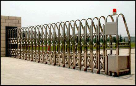 •   石家莊伸縮門(Retractable door),就是門體可以伸縮自由移動,來控制門洞大小、來控制行人或車輛的攔截和放行的一種門。伸縮門主要由門體、驅(qū)動電機,滑道、控制系統(tǒng)構(gòu)成。   門體采用優(yōu)質(zhì)不銹鋼及鋁合金專用型材制作,采用平行四邊形原理鉸接,伸縮靈活行程大。驅(qū)動器采用特種電機驅(qū)動,蝸桿蝸輪減速,并設(shè)有自動離合或手動離合器,自動離合停電時可自動啟閉,手動離合停電時可手動啟閉,控制系統(tǒng)有控制板,按鈕開關(guān),另可根據(jù)需求配備無線遙控裝置??膳鋫錆L動顯示屏,顯示300-500字的顯示內(nèi)容。還可配備智能紅外線探頭防碰撞裝置,遇人或異物20-30CM可自動返回運行,從而保障車輛及行人的安全。